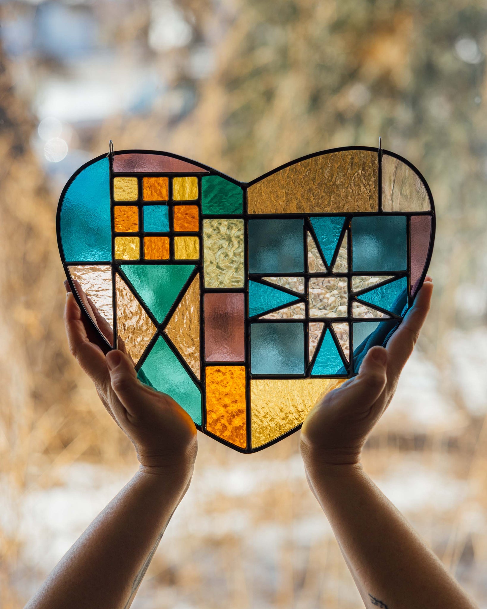 Stained glass suncatcher depicting a patchwork design with a nod to the MN state flag in the quilted style star.